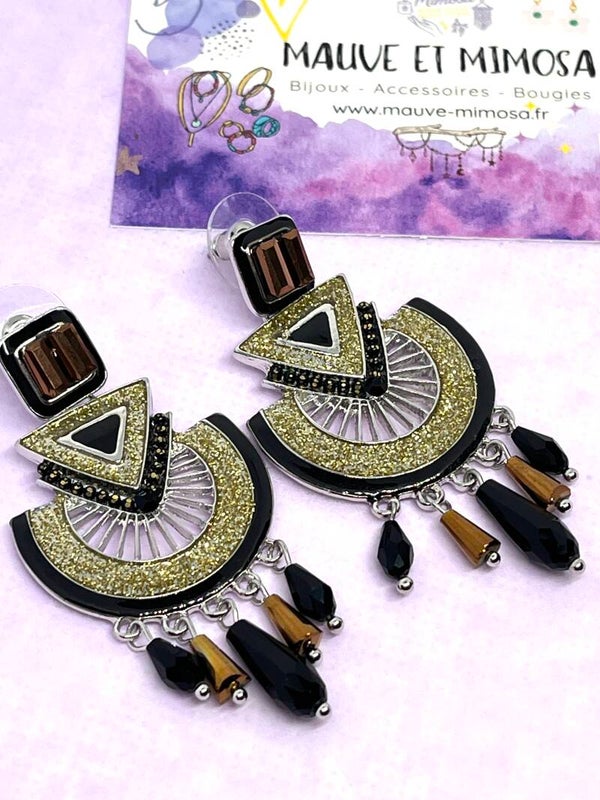 Sophistiquées et pleines de caractère, les boucles d’oreilles Éclat Noir & Or allient élégance intemporelle et design audacieux. Leur structure géométrique en demi-cercle et triangles superposés est sublimée par des détails dorés scintillants et des perles noires pendantes, créant un effet graphique chic et raffiné.