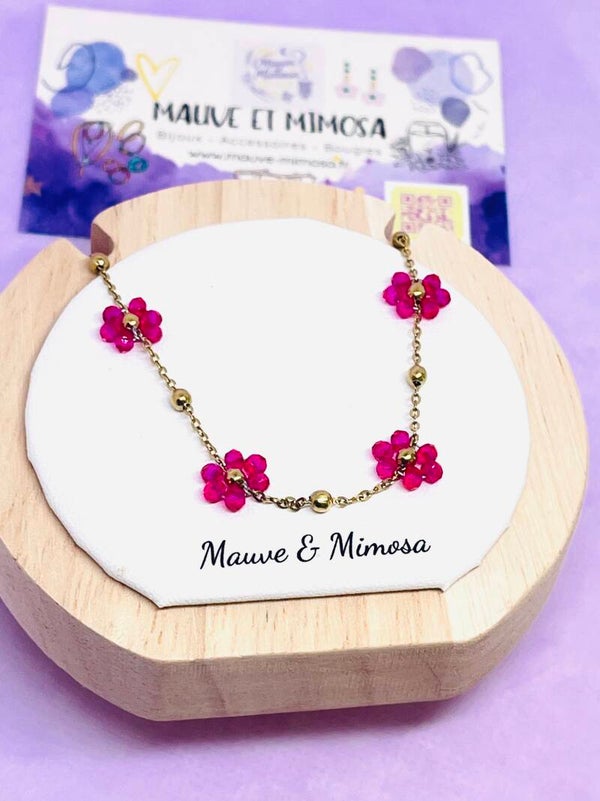 Ajoutez une touche de pep’s et de féminité à votre look avec ce collier doré en acier inoxydable, orné de délicates fleurs en perles fuchsia. Un bijou frais, lumineux et tendance, parfait pour égayer vos tenues toute l’année.